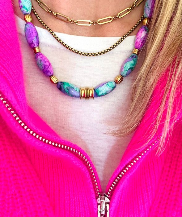 Carpe Diem > Colliers GARANCE Référence produit : 12441158 Ce collier a été fabriqué à la main et en série limitée dans notre atelier situé en Belgique. Il se compose de perles de verre et de perles en acier inoxydable. Coloris: violet/fushia, vert, gold. Longueur: 43cm > 48cm. Taille : Taille Unique 45 € Quantité : 1 Retour à la catégorie - Colliers