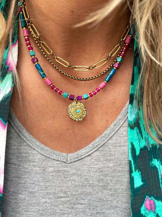 Carpe Diem > Colliers ANEMONE ROSE Référence produit : 33059084 Ce collier a été réalisé à la main et en série limitée dans notre atelier situé en Belgique. Il se compose de perles en pierres, en verre et dun pendentifs en acier inoxydable et zircon. Coloris: mauve, rose, turquoise et gold. Longueur: 39,5cm > 44,5cm. Taille : Taille Unique 50 € Quantité : 1 Retour à la catégorie - Colliers